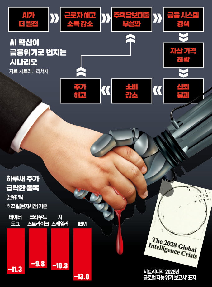 23일, **시트리니리서치**가 공개한 보고서가 화제가 됐다.핵심은 하나다. AI 종말론 이 정도였나…2년 남았다 공포에 휩싸인 美 | 한국경제https://www.hankyung.com/article/2026022420671 AI로 인한 대량
