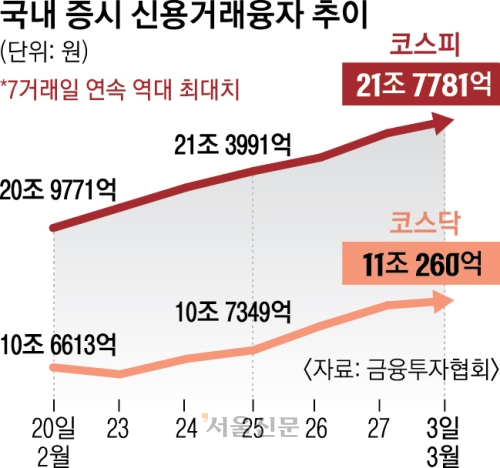 시장에서는 특히 이른바 ‘반대매매’ 가능성을 경계하고 있다. 담보 가치가 일정 기준 아래로 떨어지면 증권사는 투자자에게 추가 증거금을 요구하고 이를 채우지 못할 경우 이튿날이나 그다음 영업일 장 시작 무렵 주식을 강제로 매도할 수 있다. 한 증권사 관계자는 “강제 매도 물량이 장 초반 한꺼번에 나오면 지수 하락을 다시 키우는 악순환이 나타날 수 있다”고 말했다. 증권사들도 신용거래 확대에 따른 리스크 관리에 나섰다. NH투자증권은 5일부터 신용거래융자 신규 매수를 중단하기로 했다.